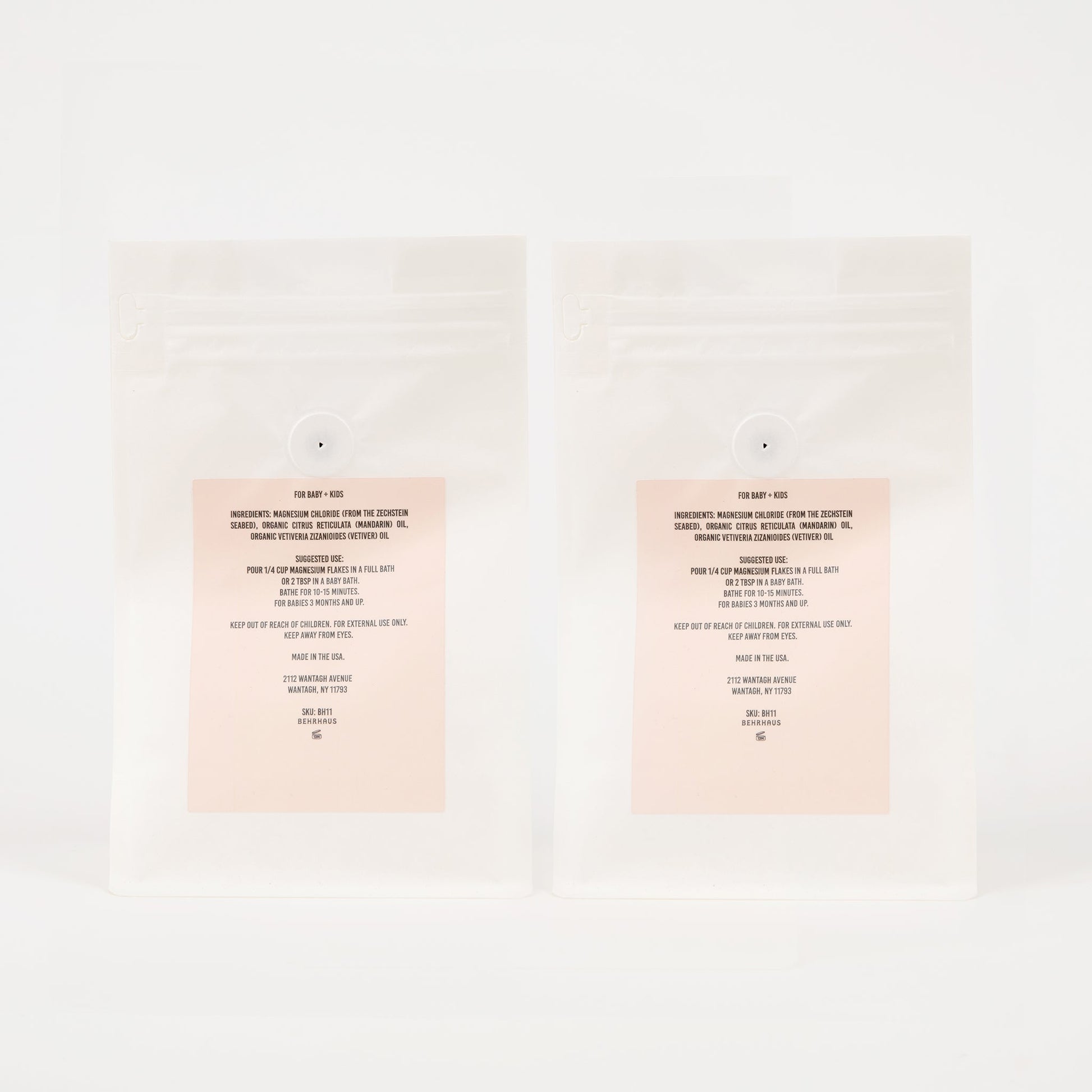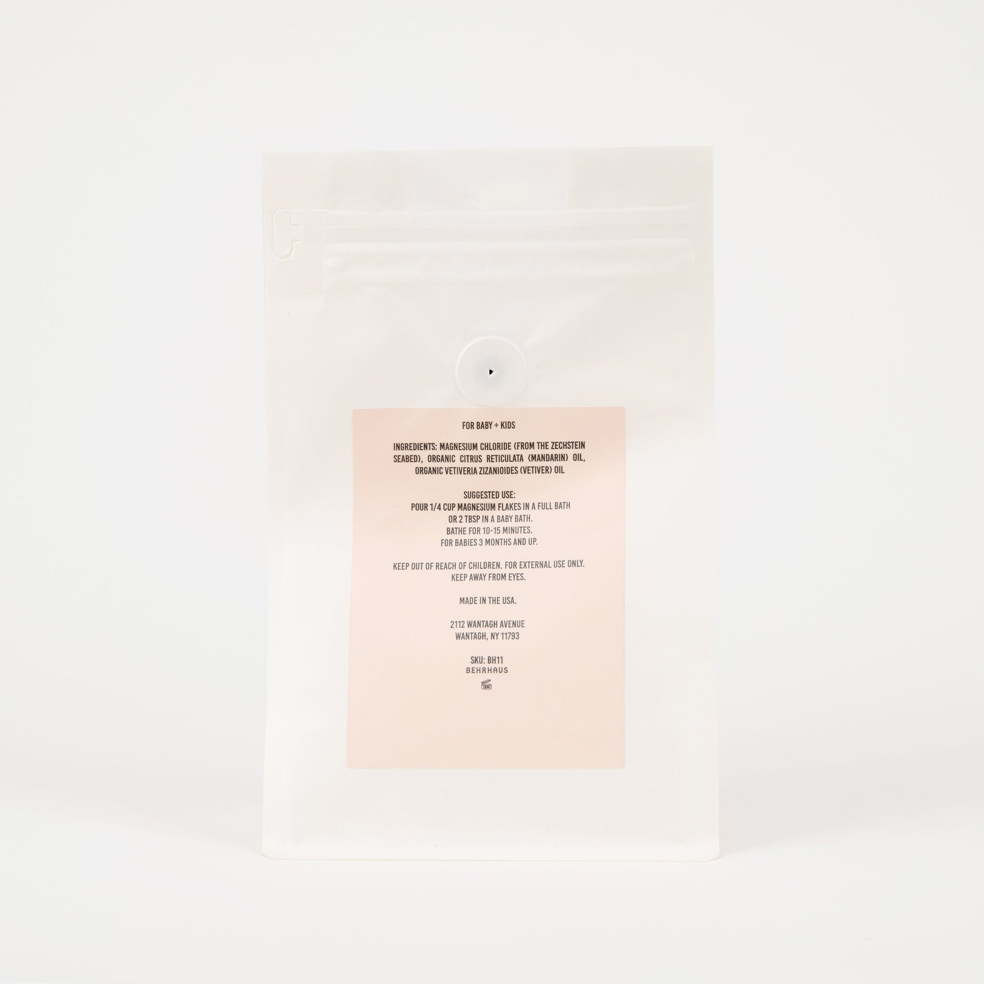 Pour 1/4 cups Magnesium flakes in a full bath or 2 tbsp in a baby bath. Bathe for 10-15 minutes. For Babies 3 months and up.