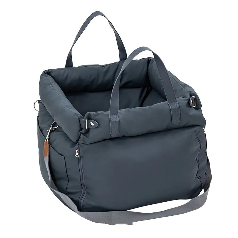 Portable, removable, and washable car kennel for cats or small dogs. Made of cloth, anti-dirty, easy to clean, and ensures pet safety during car travel. Dimensions: 55x50x45cm. Available in brown, dark blue, or green/orange.