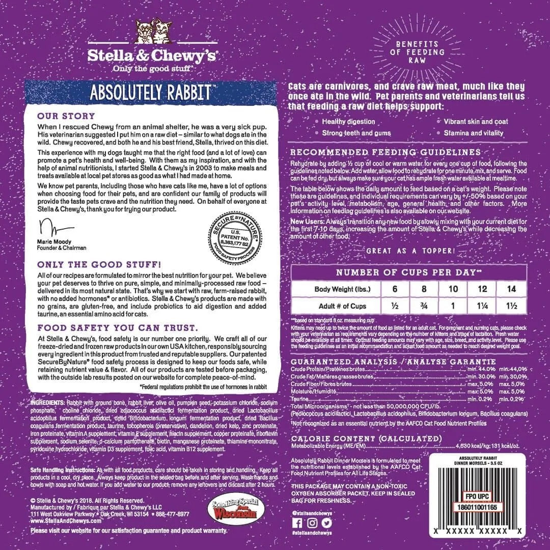 Ingredients: Rabbit with Ground Bone, Rabbit Liver, Olive Oil, Pumpkin Seed, Potassium Chloride, Sodium Phosphate, Choline Chloride, Dried Pediococcus Acidilactici fermentation product, Dried Lactobacillus Acidophilus fermentation product, Dried Bifidobacterium Longum fermentation product, Dried Bacillus Coagulans fermentation product, Taurine, Mixed Tocopherols (preservative), Dandelion, Dried Kelp, Zinc Proteinate, Iron Proteinate, Vitamin A Supplement, Vitamin E Supplement, Niacin Supplement, Copper Proteinate, Riboflavin Supplement, Sodium Selenite, D-calcium Pantothenate, Biotin, Manganese Proteinate, Thiamine Mononitrate, Pyridoxine Hydrochloride, Vitamin D3 Supplement, Folic Acid, Vitamin B12 Supplement