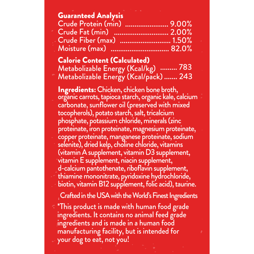 Ingredients: Cage-Free Chicken, Chicken Bone Broth, Organic Carrots, Tapioca Starch, Organic Kale, Tricalcium Phosphate, Sunflower Oil (Preserved with Mixed Tocopherols), Calcium Carbonate, Potato Starch, Salt, Potassium Chloride, Choline Chloride, Dried Kelp, Zinc Proteinate, Magnesium Proteinate, Copper Proteinate, Manganese Proteinate, Selenium Yeast, Vitamin A Supplement, Vitamin D3 Supplement, Vitamin E Supplement, Niacin Supplement, D-calcium Pantothenate, Riboflavin Supplement, Thiamine Mononitrate, Pyridoxine Hydrochloride, Biotin, Vitamin B12 Supplement, Folic Acid