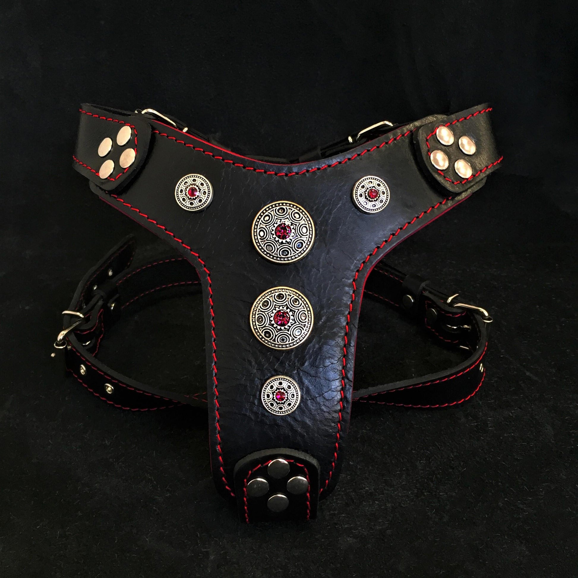 The "Bijou" harness is as unique as your dog. Featuring 2 round old silver rivets with red fitted rhinestones. This harness is completely hand crafted by our small team.