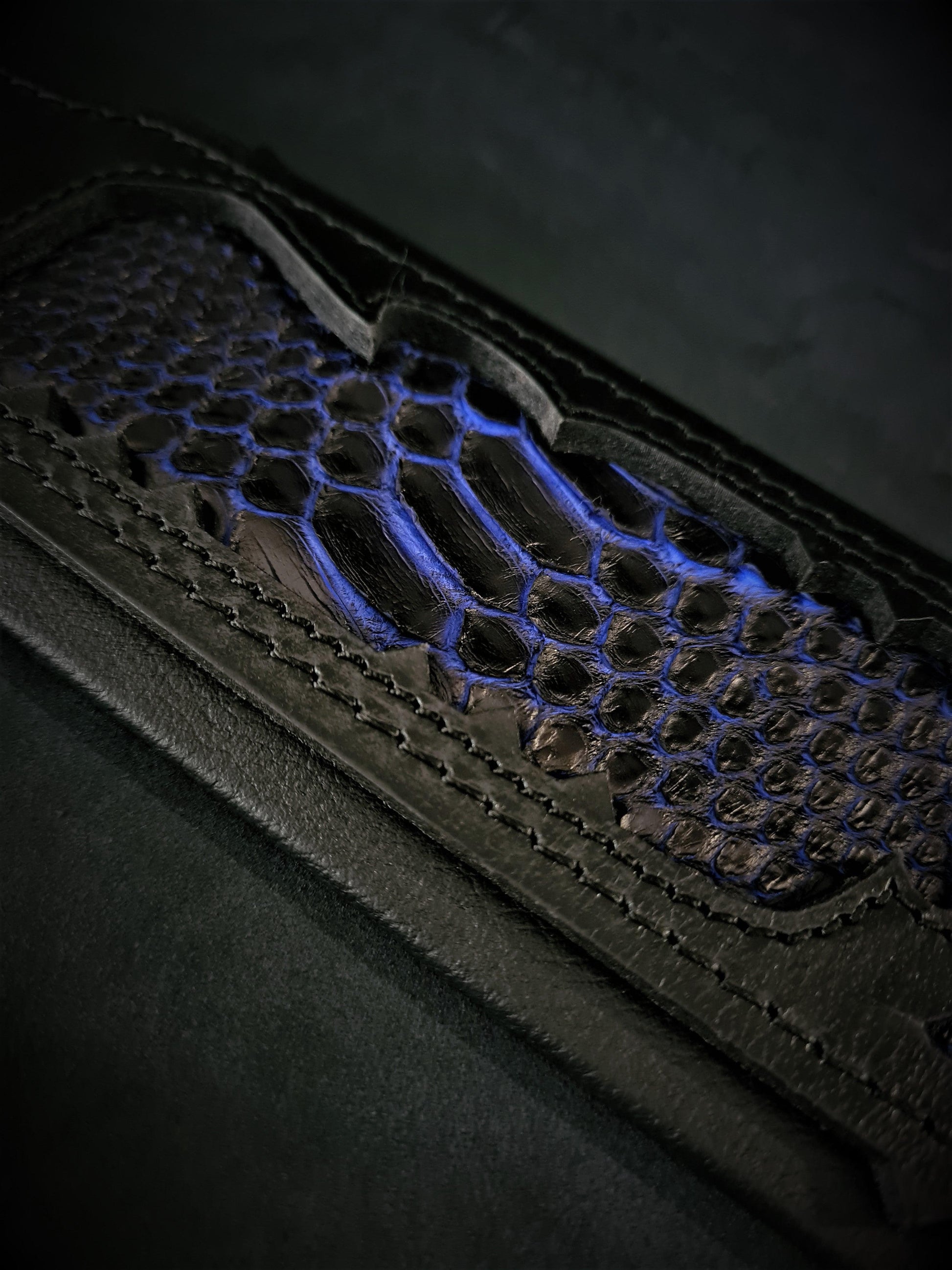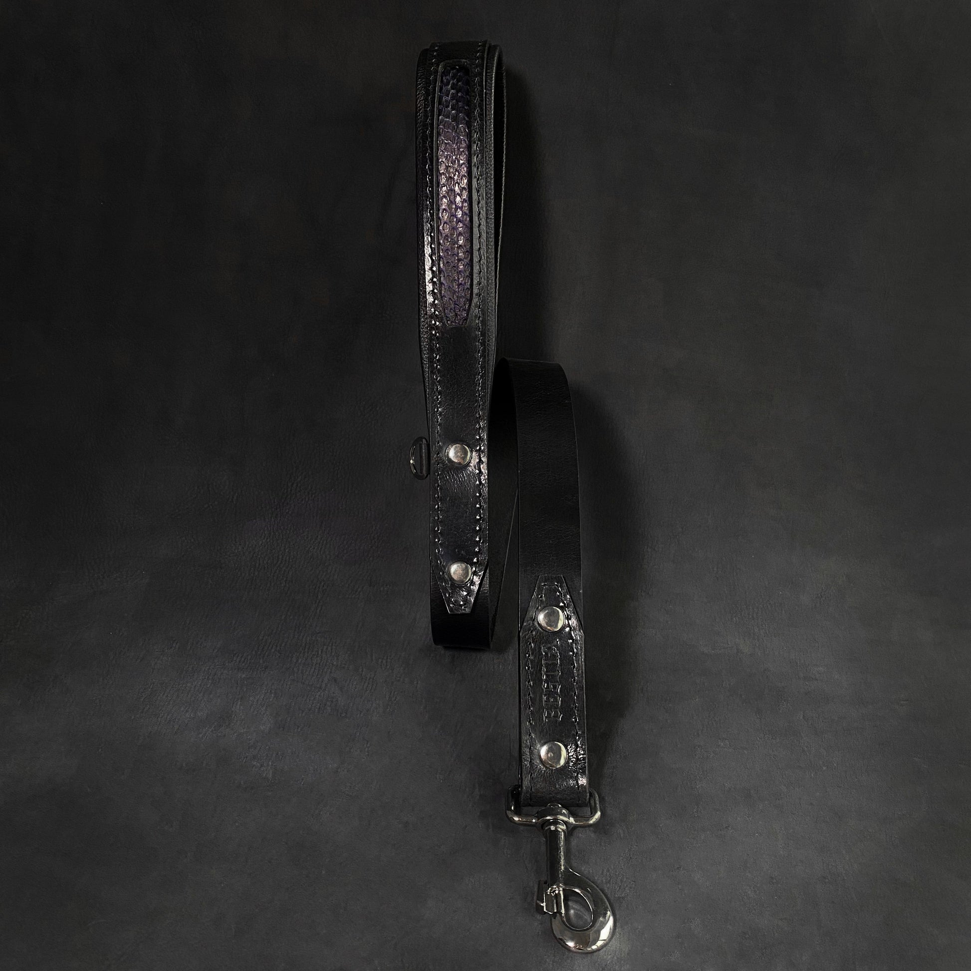 It has an unique handmade design, combining the thick black base layer leather with hand painted, one of a kind python skin decoration. They are put together nicely giving the collar exclusive looks.