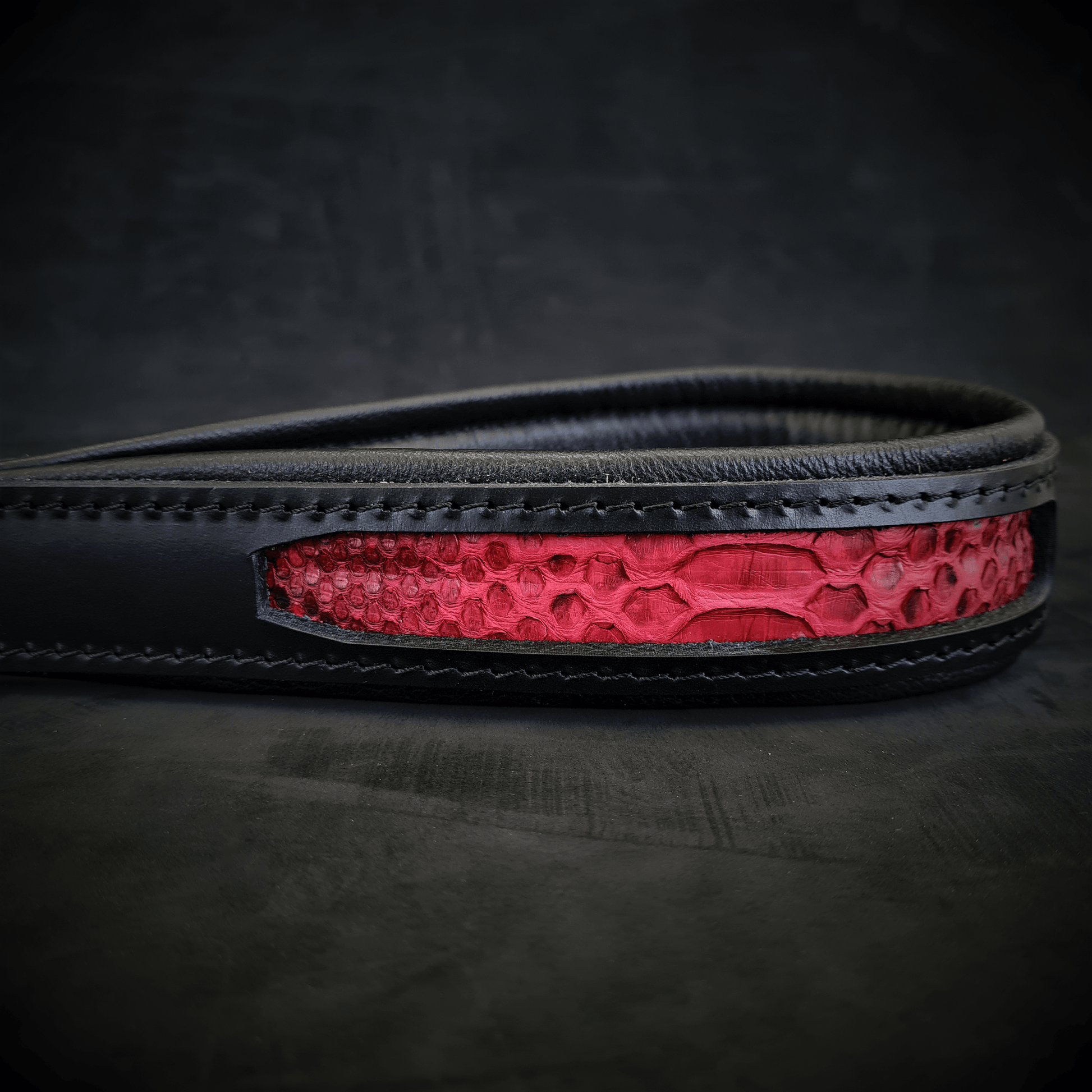 The eye-catching ''Red Dragon'' leash is a piece of art, combining the thick black base layer leather with the python patern leather. They are put together nicely giving the leash exclusive looks.